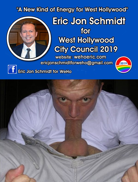 A man named Eric Jon Schmidt is running for the West Hollywood (CA) city council. He's into a bunch of sexual stuff and is pretty open about it. While it hasn't been mentioned aside from a friend who told me about it, he can selfsuck and apparently is really into it.