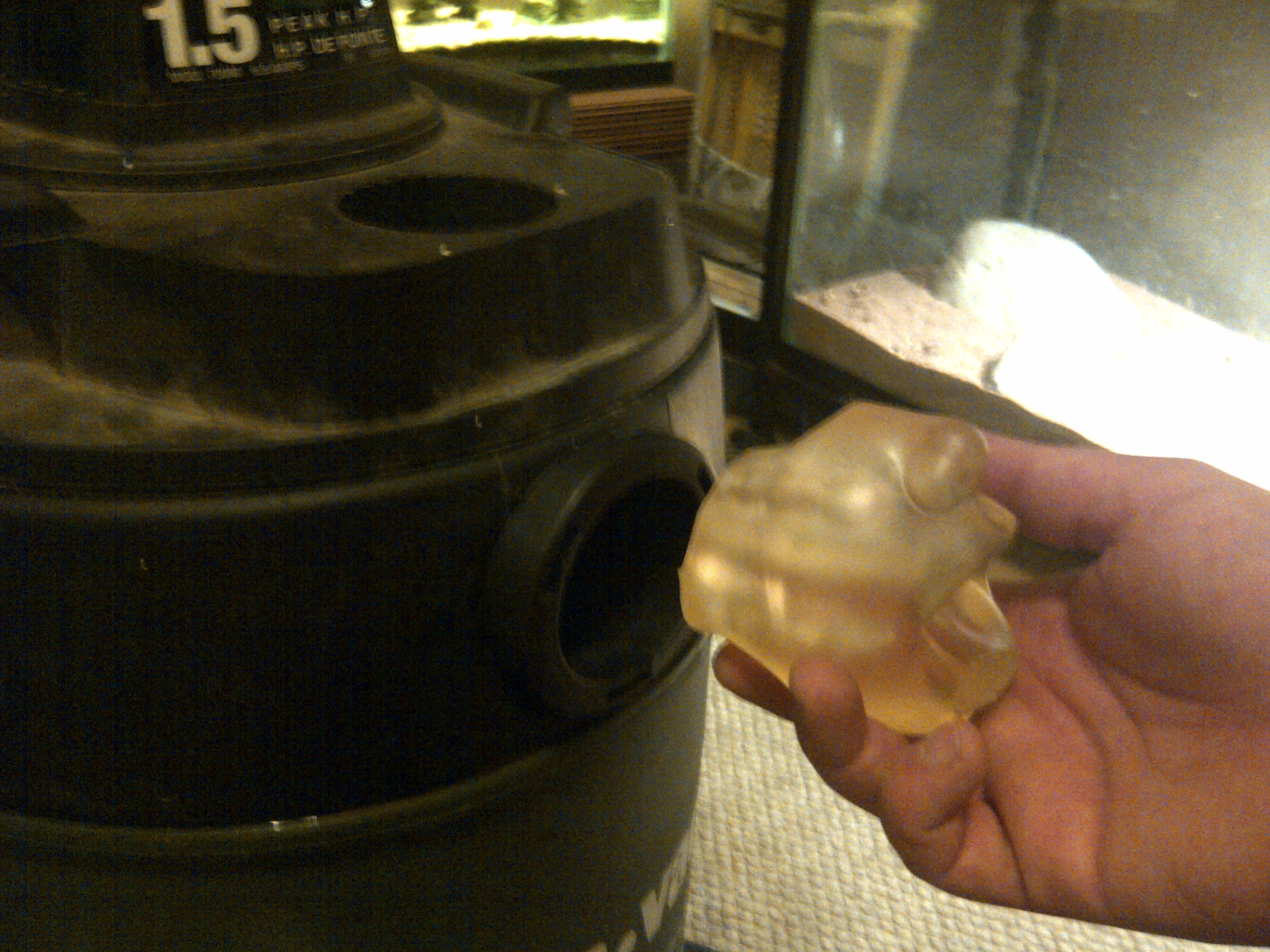 So this toy has seen better days. Its well over four years old now... I decided to take a knife to it and do some experiments. For instance, I cut the ending tube part of it into a couple pieces to make some interesting cock/ball rings. Turned out kinda neat.. (pics soon). The remaining mouth part, is only about 5 inches long now, and is being used as a suction type sucking cap that gets inserted into the vacuum hose port hole on the side of my ShopVac. Works well. Just a little loud. You figure my ShopVac is 1.5 horsepower where as a regular house vacuum cleaner is maybe 0.25hp. Its easilly twice the volume and pitch. In any case, got some pics, but battery died before I could score a a video. Will try again tomorrow.