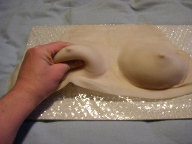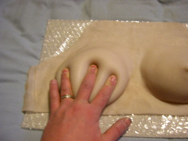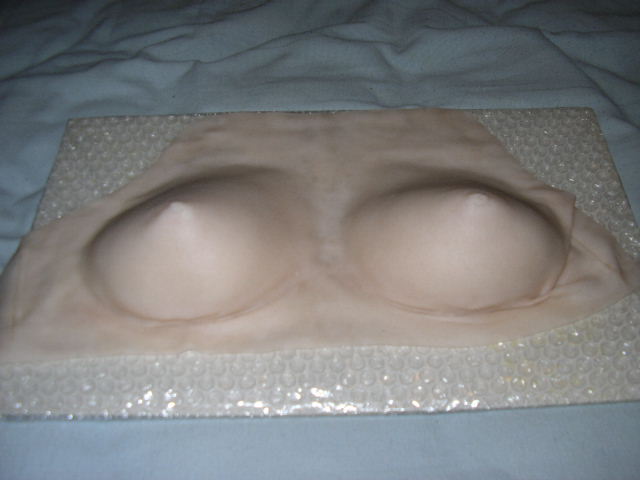 The first set I got was the B101 small breast imitation and the V208 vagina imitation panty. With shipping the order worked out to something like $254CAN. The breast prosthetic plate was really cool. It was self-adhesive and it was one entire piece, not like most breast forms which are two separate silicone boobs held together by either an additionally worn bra, or some really cheap see through plastic straps and some lousy adhesive which never lasts. The self-adhesive on the SecondBody form was really strong. In fact, if you didn't shave your chest before hand, you'd be picking hairs out of the adhesive lined back side of the breastplate for hours. Here's what it looked they looked like coming out of the box: