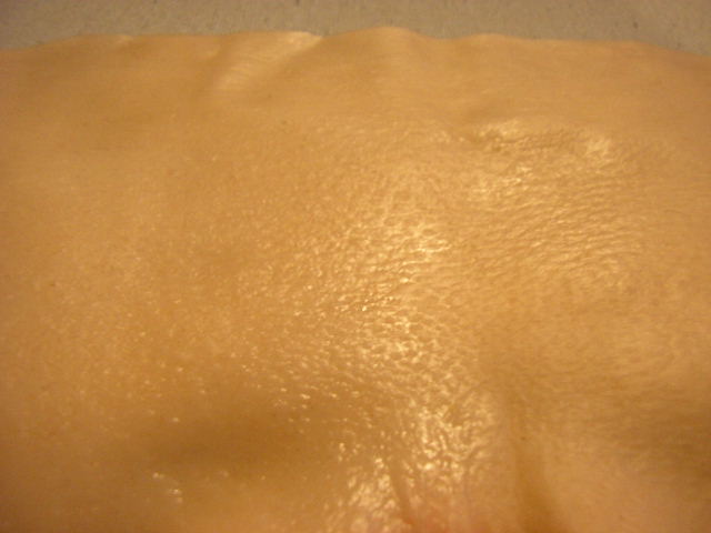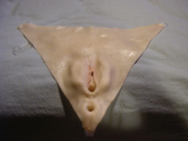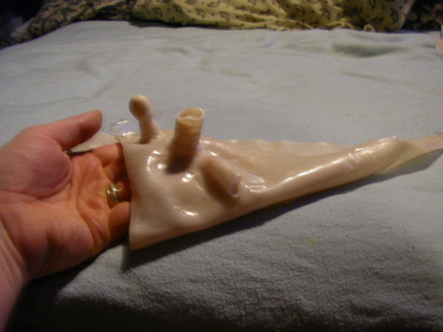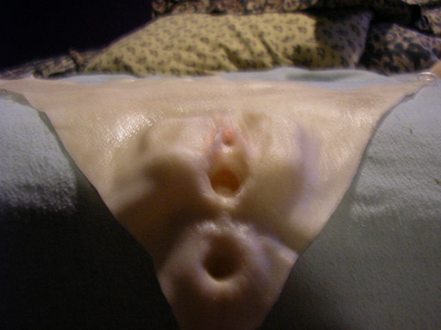 The pussy-panty was practically useless. It was too small and didn't really cover much of anything. I had to learn how to do the drag-queen genital tuck, which I never really got the hang of. I think I was able to wear it once or twice before it tore its straps loose. In pics 3 and 4 you can really see the molding transfer of the pores from the models skin. The detail there was pretty nice, but the actual vaginal details were pretty poor and to my disappointment, very small. I've never had the chance to go down on an asian woman, but this thing almost looked like it belonged to a very young female body. In the final pic you can see two sort of plugs on the backside of the panty. The first one which looks kind alike a hollow tube is just that. Its basically a hollow tube that would rest against your pubic area so that you could insert small toys into the vaginal orifice to perform shows. However, the smallest vibrator I had in the house would get caught super easy and pull the whole prosthetic away from your skin and ruin any chance at any illusion. The second plug which is sitting on my index finger in that pic is basically the prosthetic's anal orifice, which is supposed to go up into your own anus to act as a sort of anchor for the panty. However this plug was entirely way too small to actually stay in my anus. So the whole thing never really worked right at all.